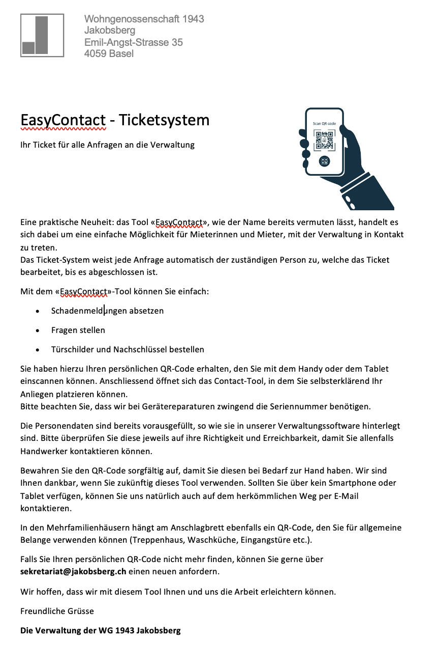 Wir haben das Tool «EasyContact» eingeführt, um eine einfache Kontaktaufnahme sowie Schadenmeldungen zu ermöglichen.